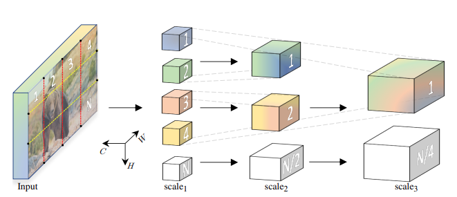 This creates a multiscale hierarchy similar to CNNs - early stages process high-resolution spatial-temporal data with simple features (fewer channels), while later stages process lower-resolution data but with more complex, abstract features (more channels).