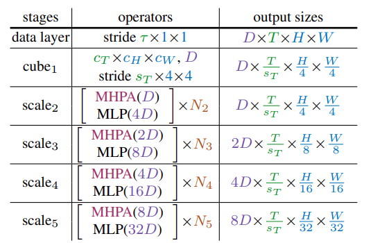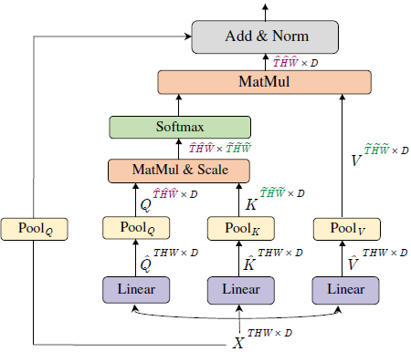 If you downsample space-time resolution by 4, you increase channels by 2. So a resolution change from \(2D \times \frac{T}{δ_t} \times \frac{H}{8} \times \frac{W}{8}\) to \(4D \times \frac{T}{δ_t} \times \frac{H}{16} \times \frac{W}{16}\) roughly preserves computational complexity while building a hierarchical feature pyramid. This is essentially applying the CNN principle of “deeper = more channels, lower resolution” to video transformers.